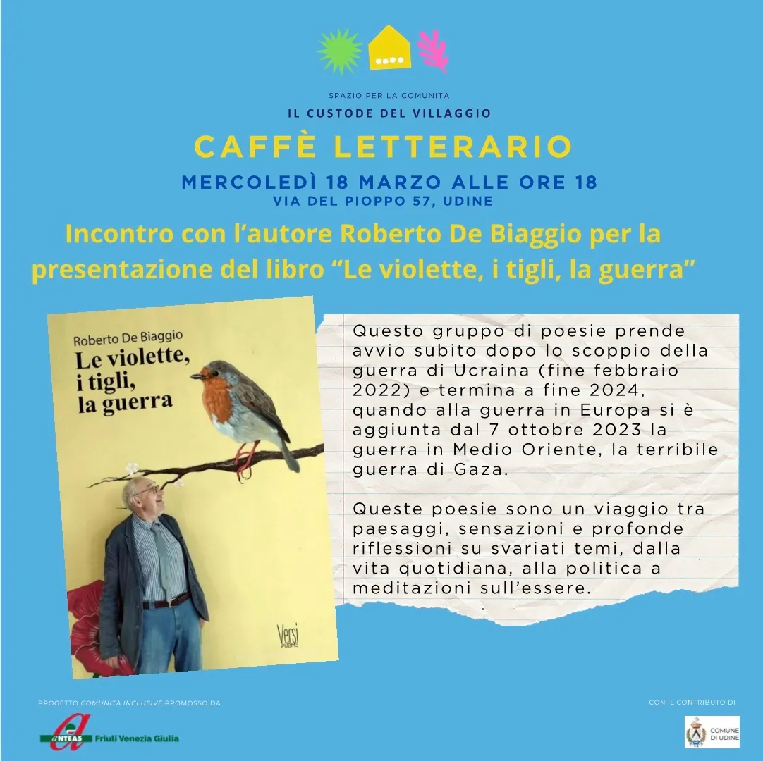 Mercoledì 18 marzo alle ore 18 alla Casa del Custode vi aspettiamo per la presentazione della raccolta di poesie “Le violette, i tigli, la guerra” di Roberto De Biaggio.