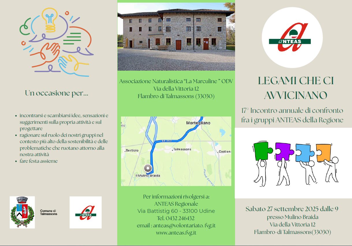 Sabato 27 settembre si terra l’incontro annuale di confronto fra i gruppi ANTEAS della regione presso il Mulino di Flambro. Si tratteranno argomenti riguardanti la solidarietà, l’essere comunità e legami.