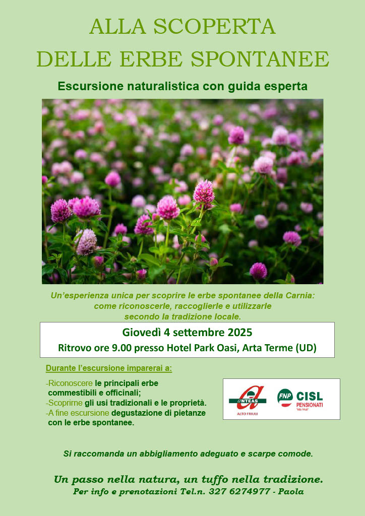 20 Agosto 2025Il 4 settembre presso Hotel Park Oasi ad Arta Terme, si terrà un incontro per scoprire le erbe spontanee della Carnia, dove si avrà modo di imparare a riconoscerle, raccoglierle e a usarle secondo la tradizione locale. Durane l’escursione si imparerà a riconoscere le principali erbe commestibili e officinali e a scoprirne gli usi tradizionali e le proprietà. Alla fine dell’escursione ci sarà anche una degustazione di pietanze con erbe spontanee.