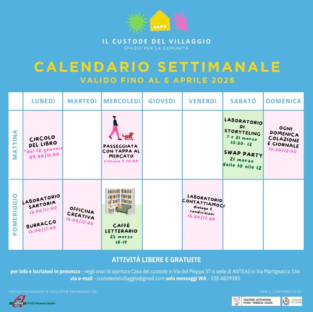 16 Marzo 2026Ecco il nuovo calendario delle attività alla Casa del Custode in Via del Pioppo 57 a Udine, al Villaggio del Sole.